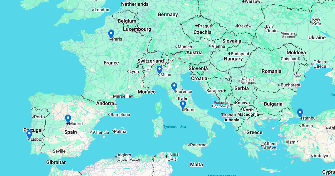 Our seven homes abroad: Paris, Madrid, Lisbon, Istanbul, Milan, Florence, and Rome