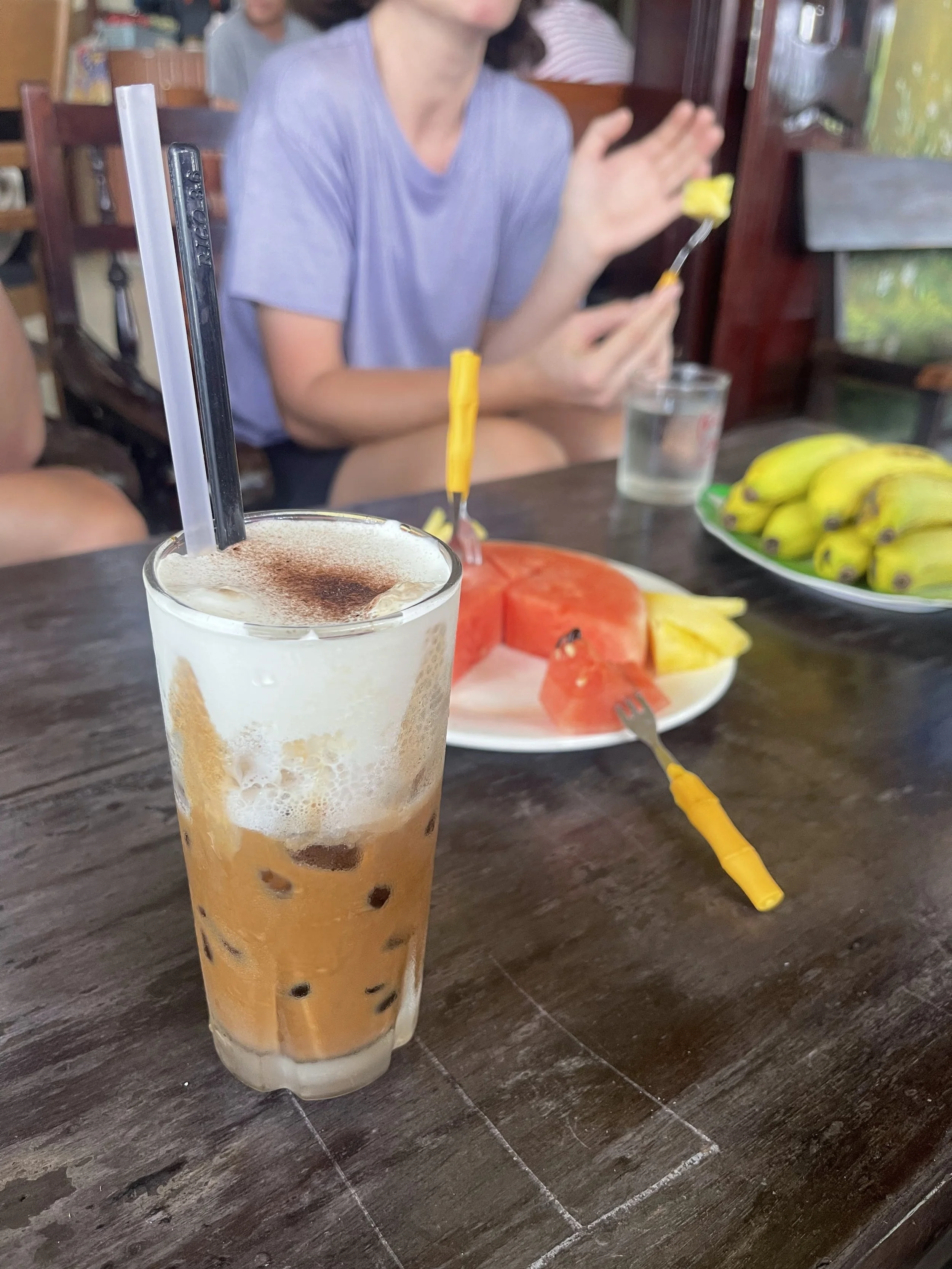 Usually I don’t miss a morning coffee. Yet thanks to my Thai stomach bug, I’d gone four straight days of only tea. The timing felt too perfect once I learned about Vietnamese coffee. They use a different type of bean than all the coffee we generally consume in the West, the species Arabica. In my (to that point) 16 years of drinking coffee, I’d never heard of the bean Robusta, much less tasted it. So at our breakfast the next morning, was I excited for the dim sum? Yes. The beef pho? Absolutely. But the one thing I could not wait for, the thing I itched for, was a sip of Robusta coffee. And…